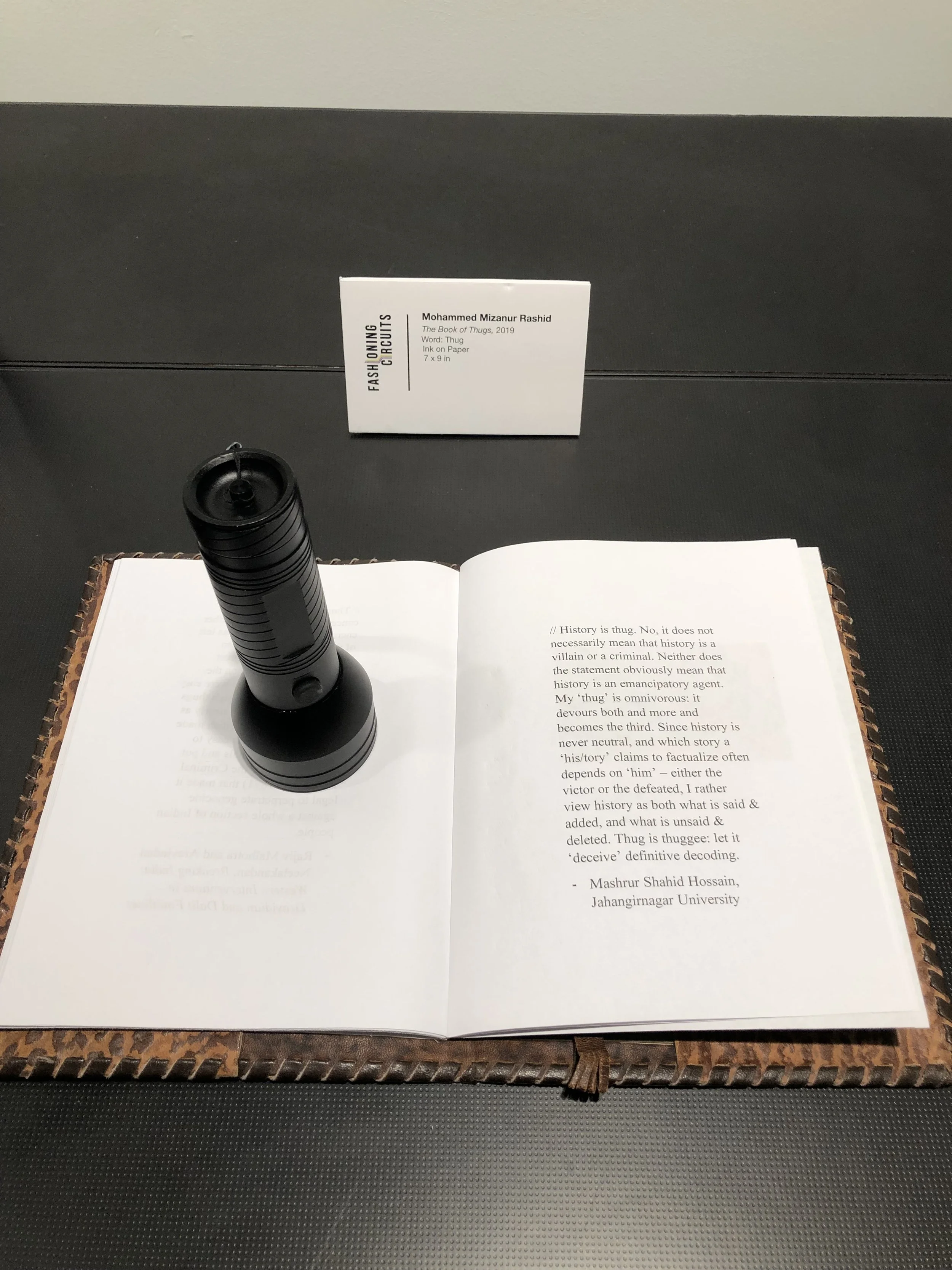 ‘The Book of Thugs’ is an interactive transmedia installation. The project is interested in decolonizing and recovering alternate histories. The word thug, in a traditional context, refers to a brutal and violent person, and a more recent turn tries to reclaim the word in a celebratory perspective. This interactive transmedia art piece, however, invites viewers and spectators to engage with a book that provides an alternate historical origin story and meaning of the word ‘thug’ – one that is more rooted in South-Asian nationalism and decolonial resistance rather than how we normatively understand the word to mean today. As the participants navigate through the pages of the book, often uncovering hidden sections, they contend with the multiplicity of meanings surrounding the word ‘thug’ and are compelled to think through the politics and materiality of meaning-making.